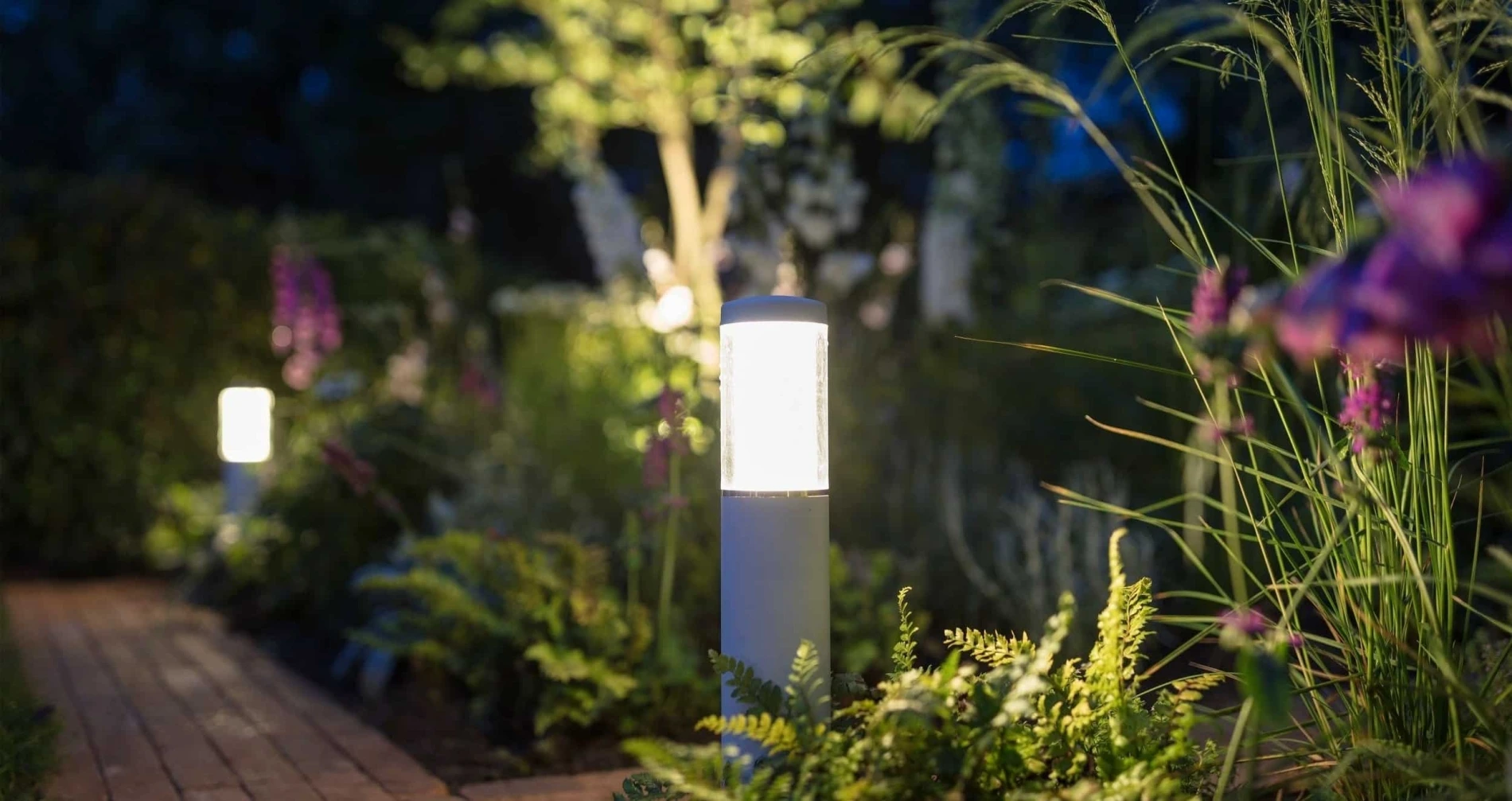 a Victoria garden/pathway lit up at night by professional landscape lighting